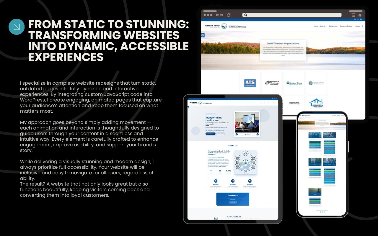 I specialize in creating custom web designs that not only captivate your audience but also enhance user experience, ensuring that every visit to your site is memorable. From sleek, responsive layouts that adapt flawlessly across devices, to user interfaces that guide your visitors effortlessly towards action, my web design services are tailored to meet the unique needs of your online presence. My dedication to innovation, combined with a deep understanding of the latest web technologies, means that your website will not just be a space on the internet, but a dynamic extension of your brand's identity. Dive into my portfolio to see how I can transform your online footprint into a powerful tool for engagement and conversion. Visit me today to start crafting a website that truly stands out in the digital landscape.