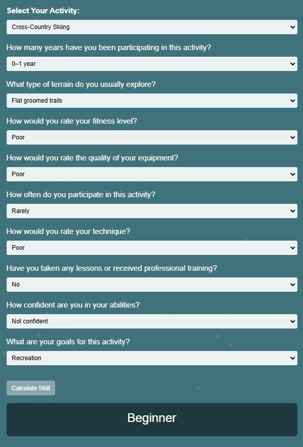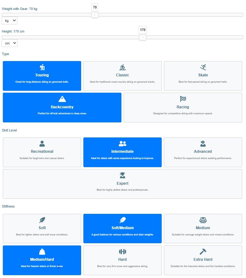 The Ski and Snowshoe Size Finder is an advanced web application that takes the guesswork out of selecting the right ski and snowshoe gear. Designed with precision and user experience in mind, this tool caters to outdoor enthusiasts by providing tailored recommendations based on individual characteristics and preferences. By integrating real-world physics, user-specific adjustments, and environmental factors, the tool ensures the perfect fit for every user.